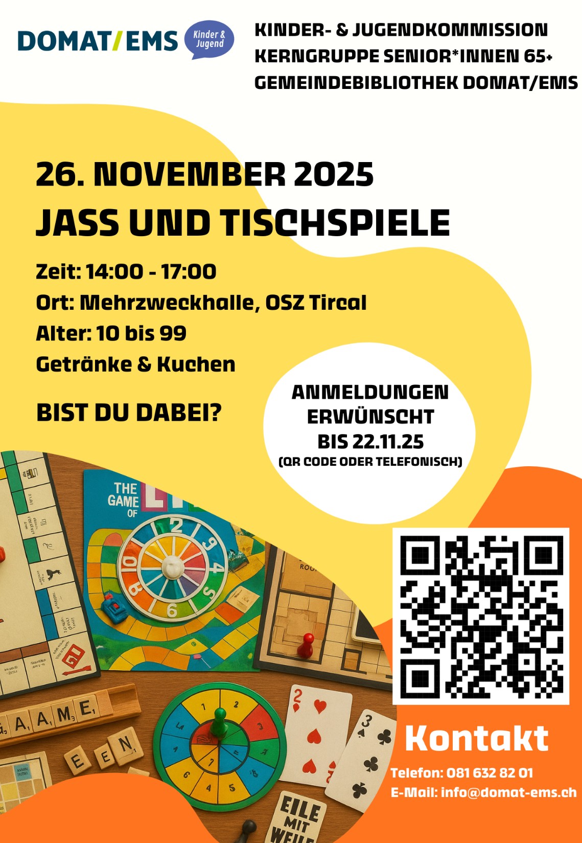 Nach diesem tollen Anlass organisieren die Kinder- und Jugendkommission, die Kerngruppe runder Tisch SeniorInnen 65+ und die Bibliothek nun zusammen den zweiten Jass- und Spielnachmittag am Mittwoch 26. November von 14.00-17.00 Uhr. Anmeldungen sind ab sofort möglich unter: